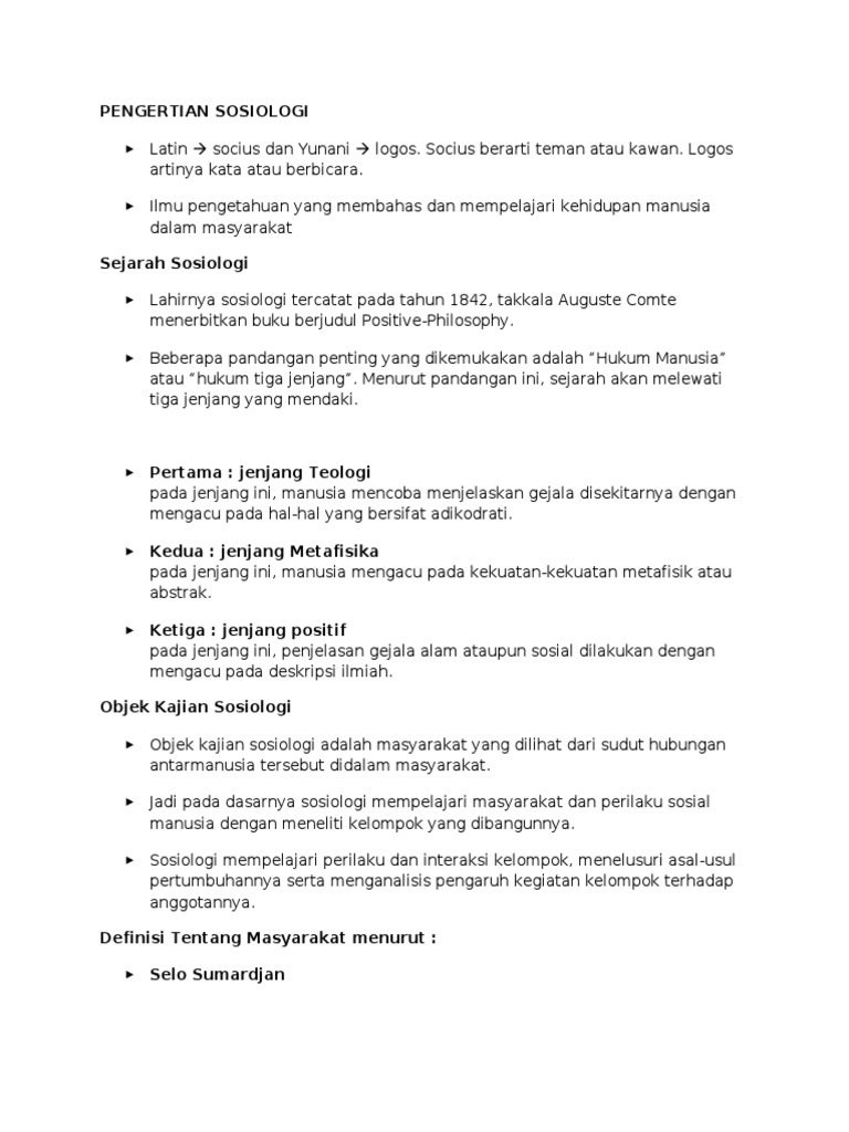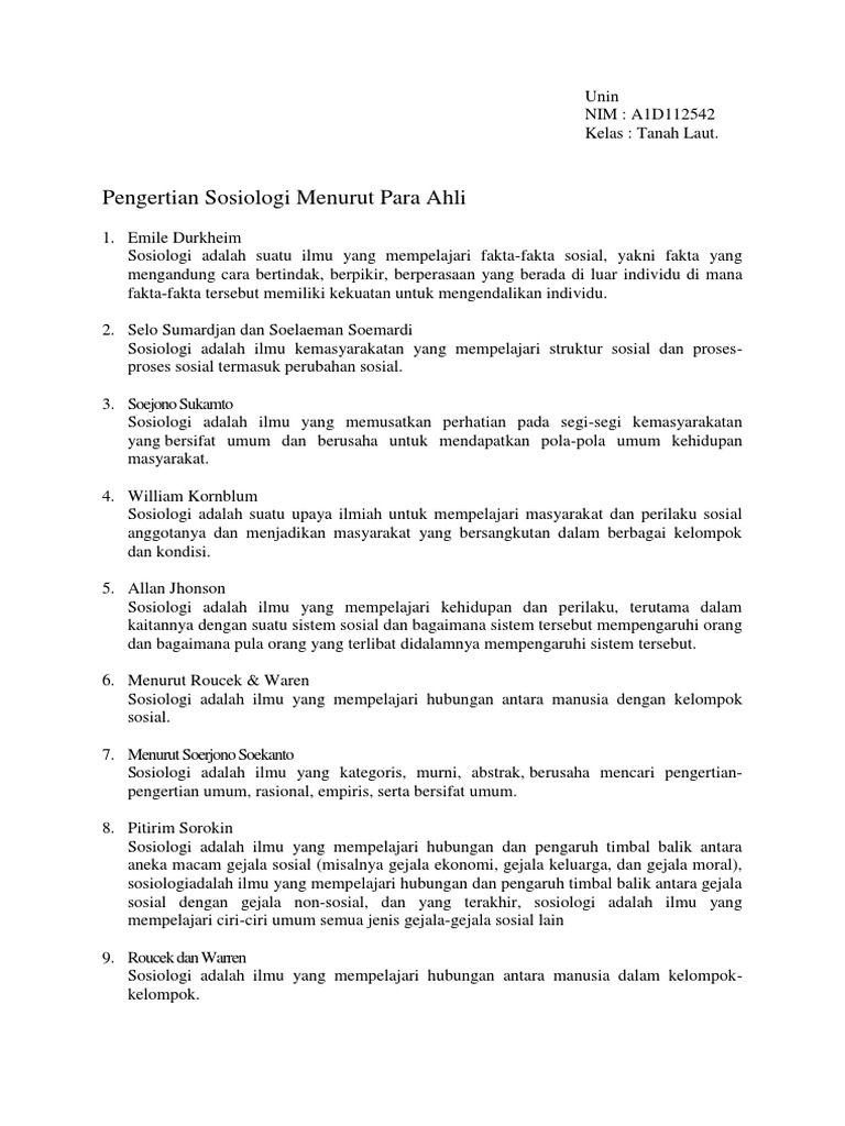 Menurutnya, pengertian sosiologi adalah ilmu pengetahuan yang memiliki fokus kajian pada hubungan sosial antar kehidupan manusia dengan kelompok sosial yang ada di lingkuangannya, dalam pandangannya manusia tidak bisa hidup sendiri sehingga memerlukan hubungan dengan manusia. Pengertian sosiologi menurut emile durkheim menurut emile durkheim sosiologi merupakan ilmu yang mempelajari fakta sosial. Sosiologi adalah ilmu yang kategoris, murni, abstrak. Namun, tidak semua tindakan manusia dapat dianggap sebagai tindakan sosial. Sosiologi merupakan ilmu yang abstrak dimana tujuannya hanya.
